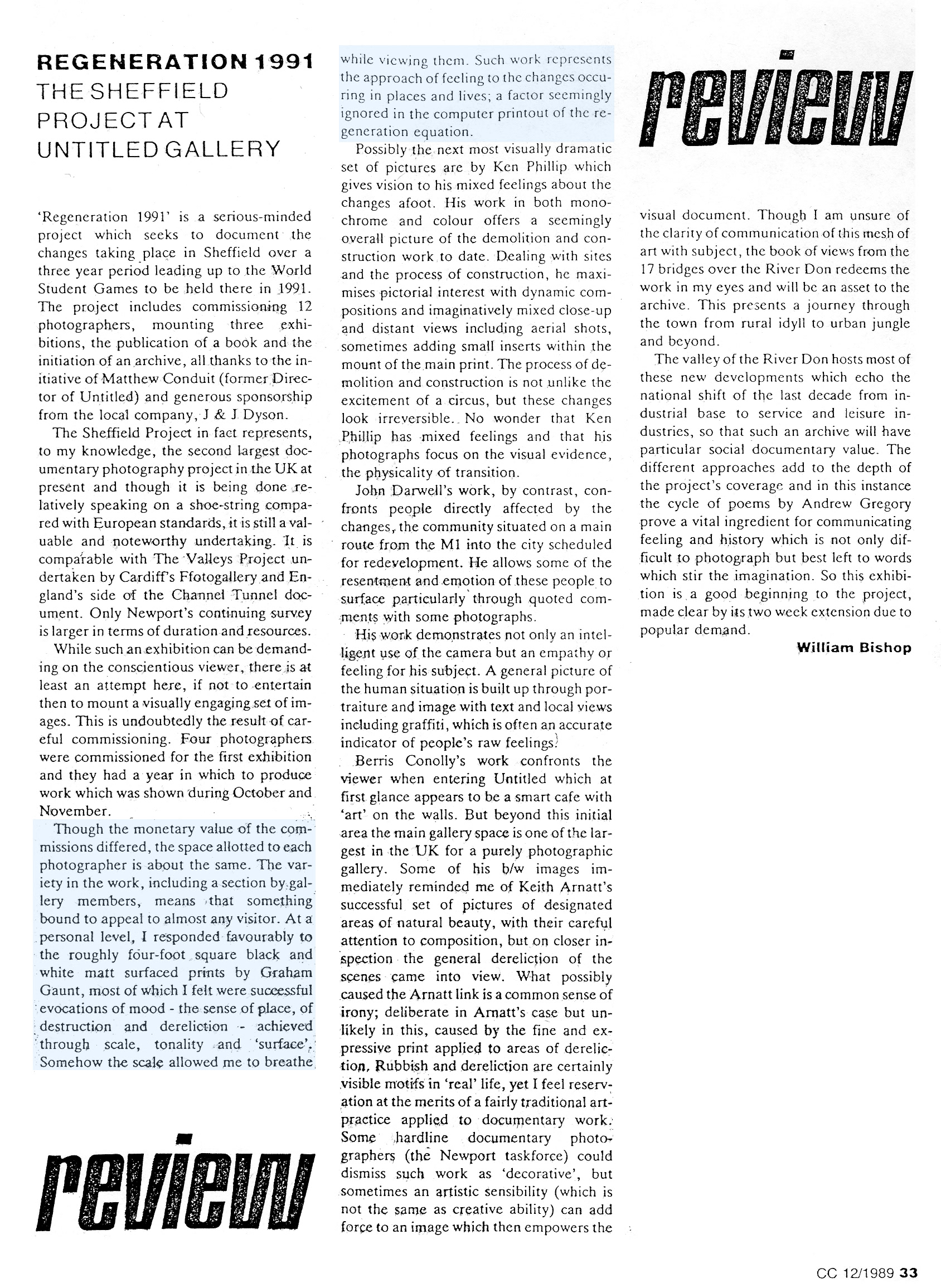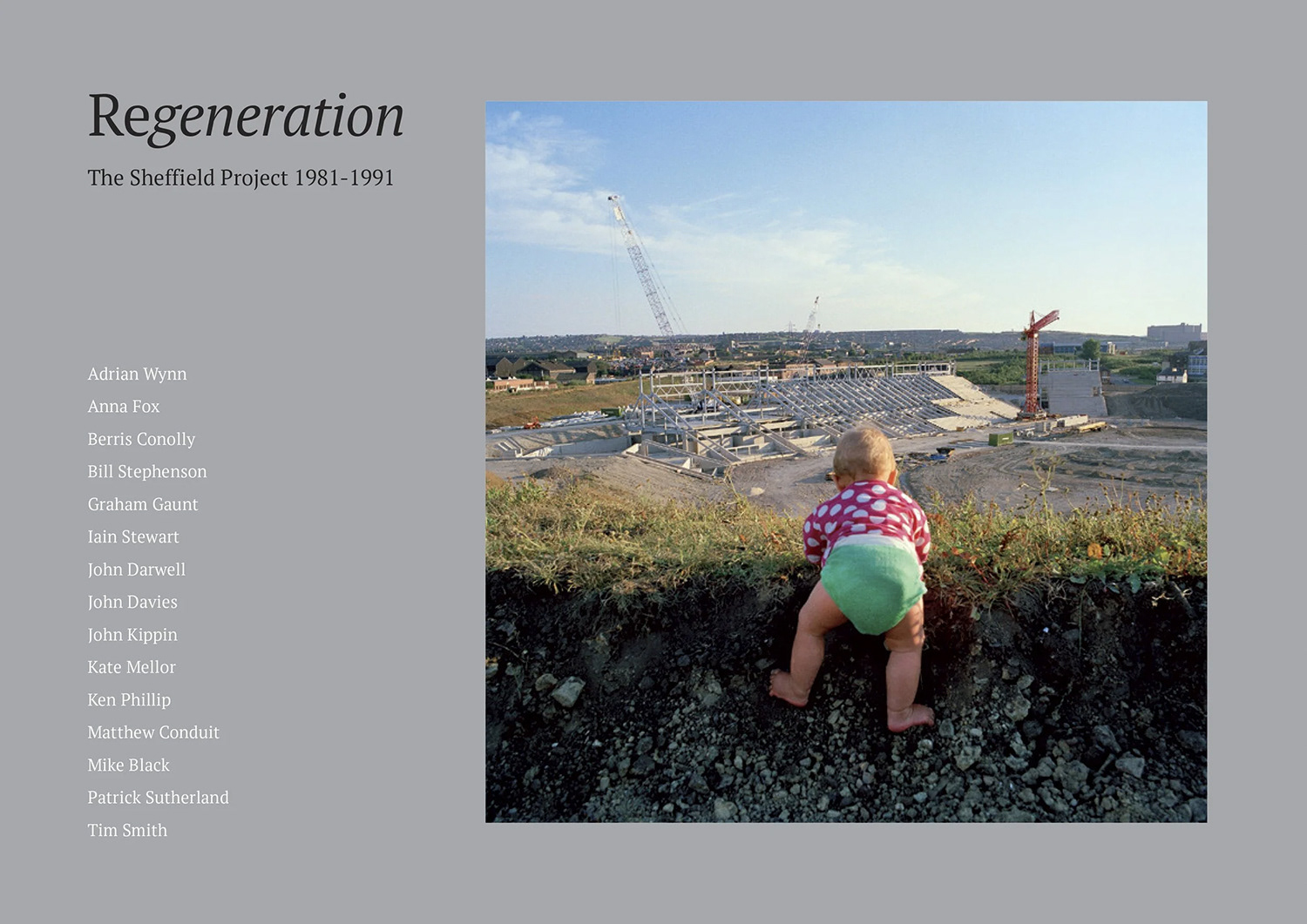 The Sheffield Project: Photographs of a Changing City features work by Mike Black, Matthew Conduit, Berris Conolly, John Darwell, John Davies, Anna Fox, Graham Gaunt, John Kippin, Kate Mellor, Ken Phillip, Tim Smith, Bill Stephenson, Ian Stewart, Patrick Sutherland and Adrian Wynn.